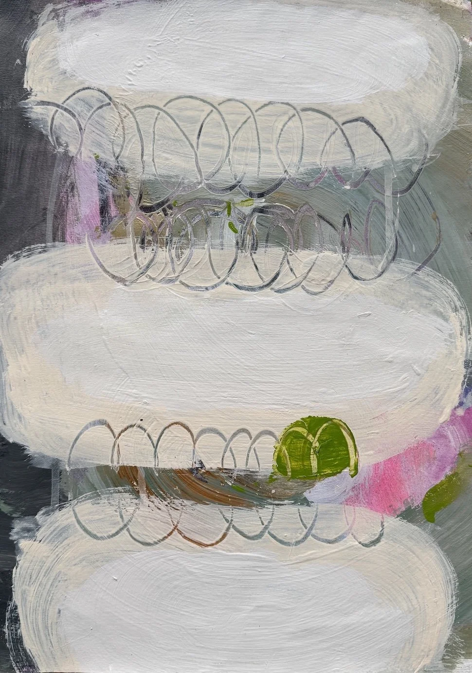 The works function as a visual diary, moving from the figurative toward the intuitive. Layers of interior paint, acrylic, oil, tearing, scraping, and drawing create a textured surface that both conceals and reveals.